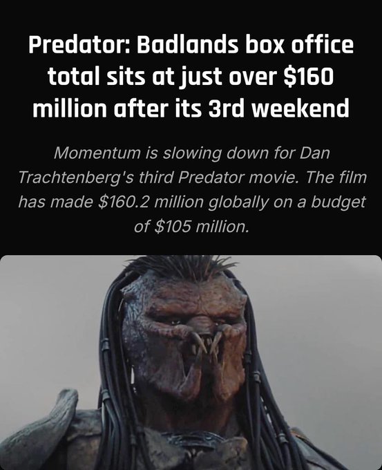 @scifiedcom #PredatorBadlands box office total sits at just over $160 million after its 3rd weekend: predator-movies.com/news/predator-…